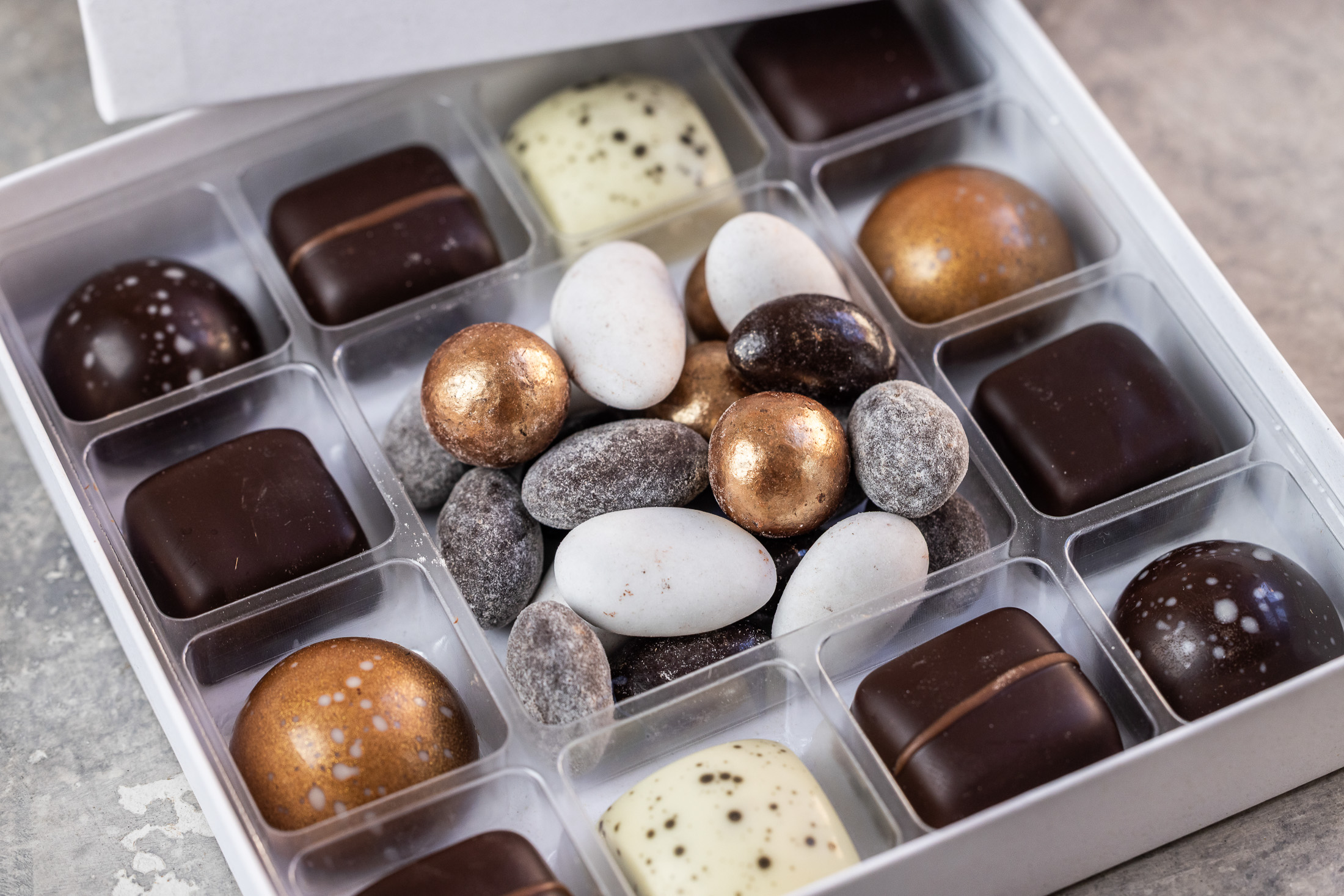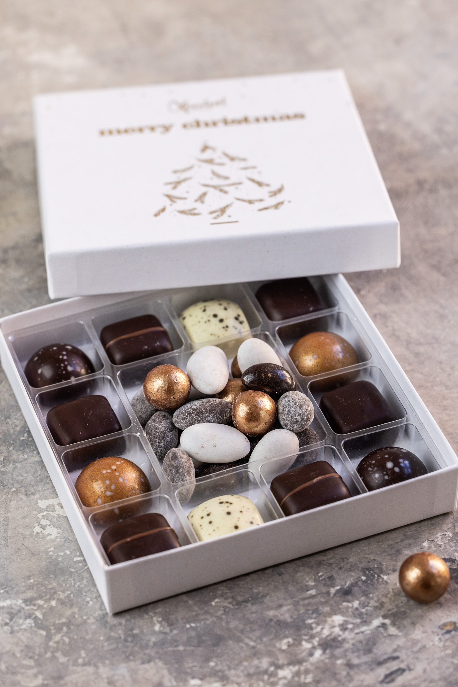 En uimodståelig gaveæske fyldt med julens søde fristelser. CHRISTMAS CRUSH 1 fra Xocolatl indeholder 12 fyldte chokolader med smagsvarianter som mint, marcipan, kirsebærmarcipan, appelsin, lakrids, hasselnød og saltkaramel. I midten gemmer sig et overdådigt dragemix med chokolademandler, chokoladelakrids og sprøde dronningemandler – perfekt som selvforkælelse eller en betænksom gave.
