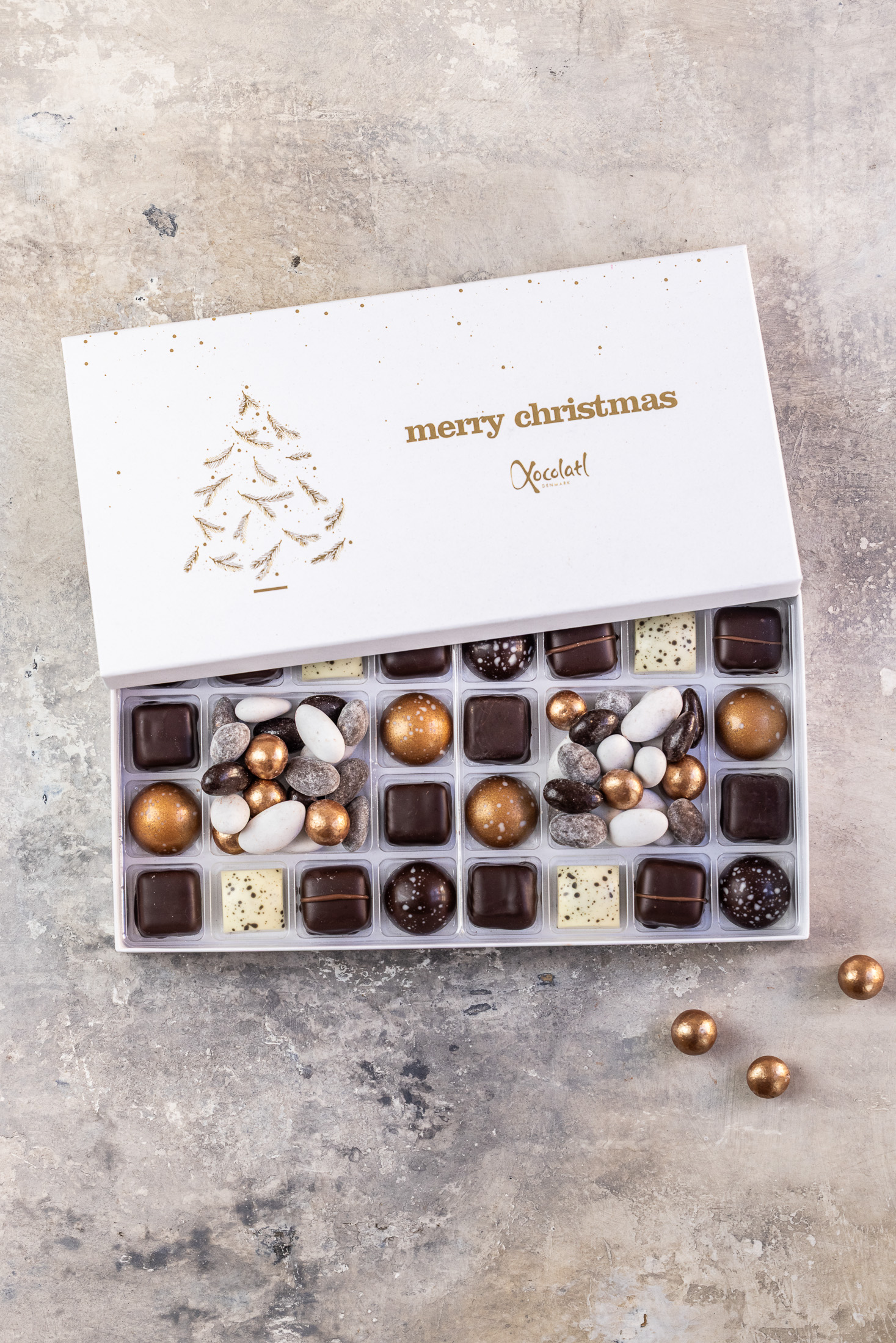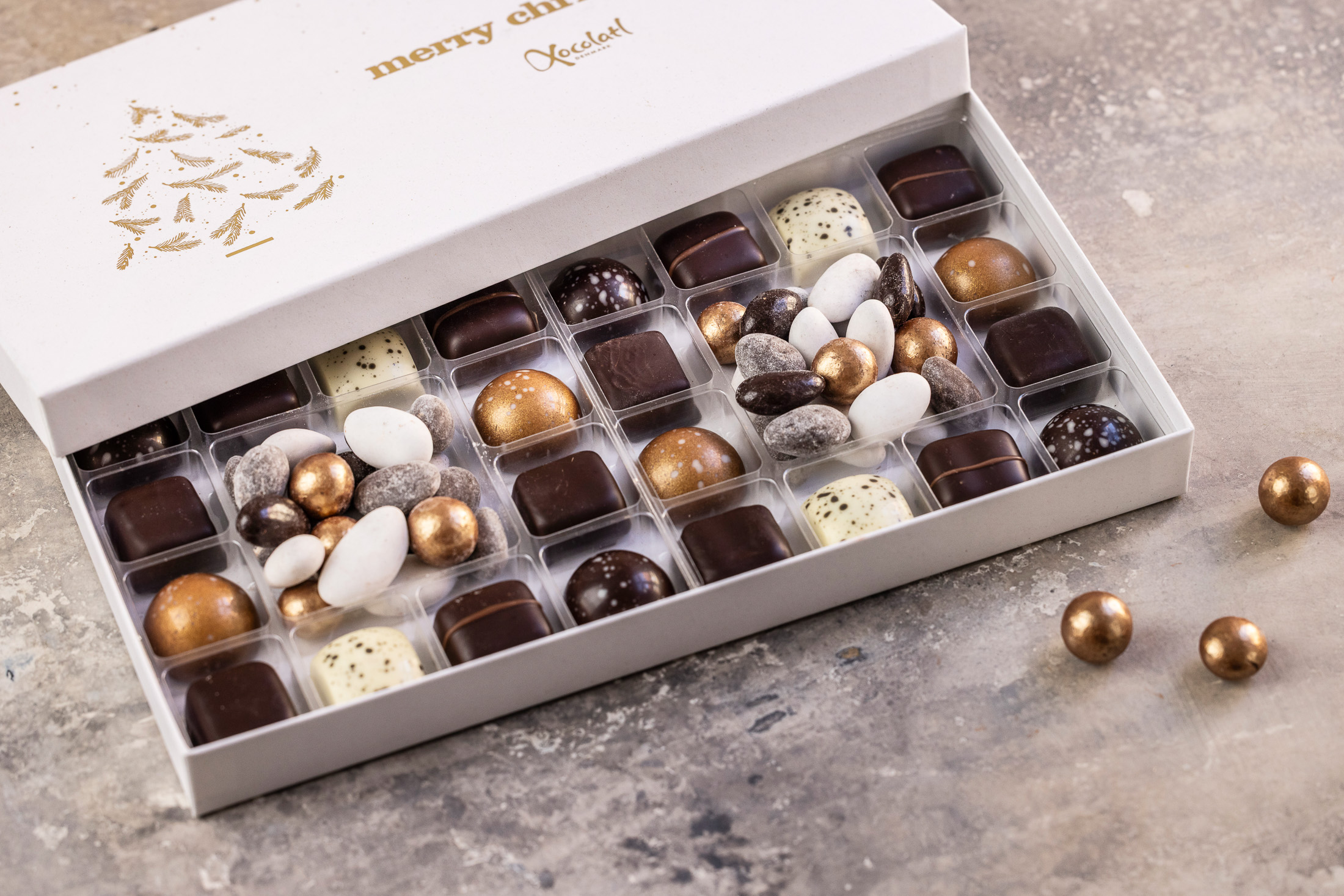 Christmas Crush 2 er en overdådig gaveæske fra Xocolatl med hele 24 fyldte chokolader i skønne smagsvarianter. Heriblandt, mint, marcipan, lakrids og saltkaramel, mm. I midten af æsken gemmer der sig et delikat dragémix bestående af forskellige mandler og chokolade – perfekt til både deling og forkælelse i juletiden.