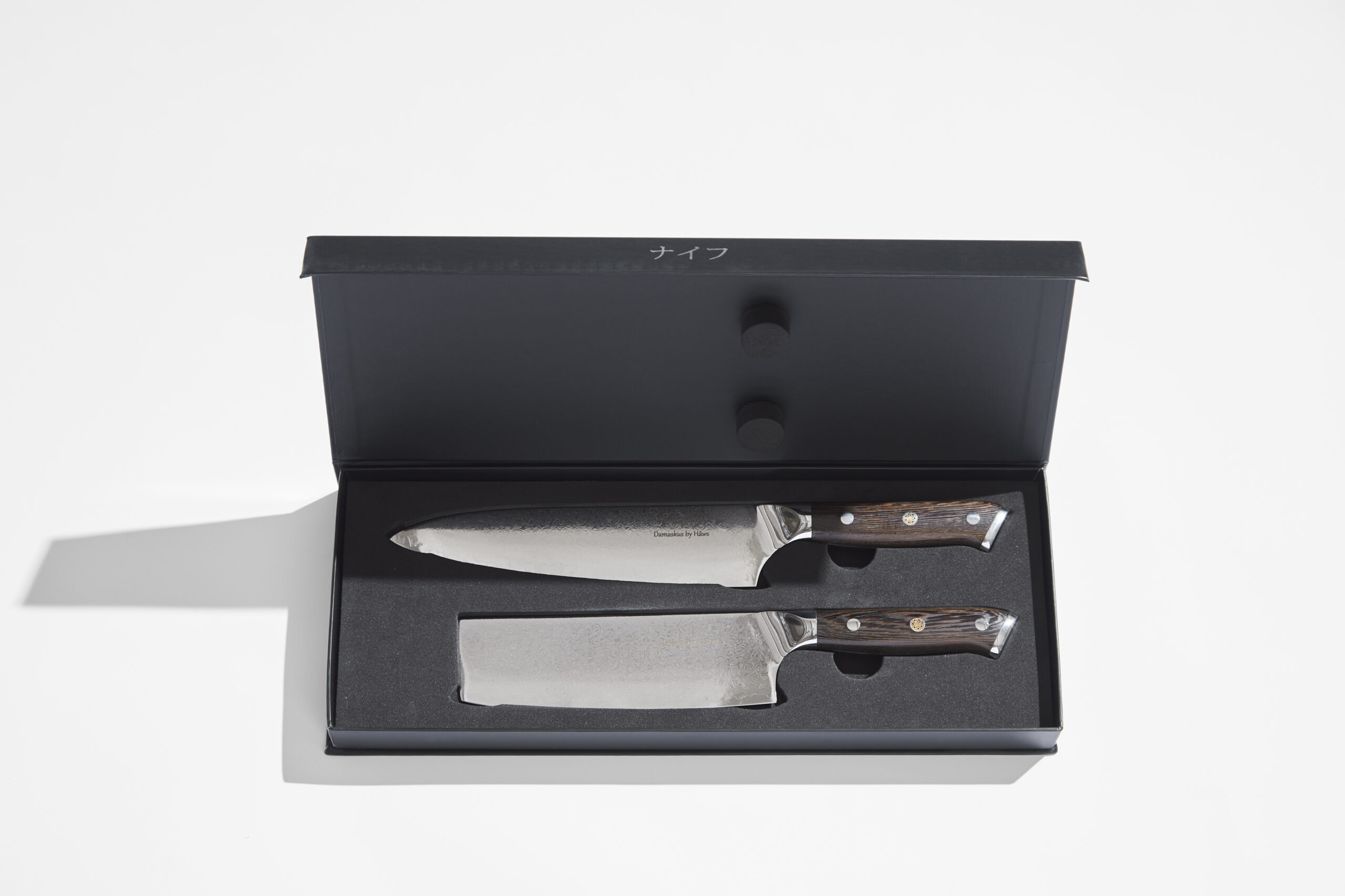 Opgrader dit køkken med et knivsæt i absolut topklasse. Damascus by Hâws Chef & Nakiri knive er fremstillet af 67 lag ægte Damascus-stål, som ikke blot giver en uovertruffen skæreevne, men også et karakteristisk, elegant bølgemønster. Knivene er hærdet til HRC 59–60, hvilket er væsentligt højere end traditionelle køkkenknive – og sikrer langvarig skarphed og holdbarhed.