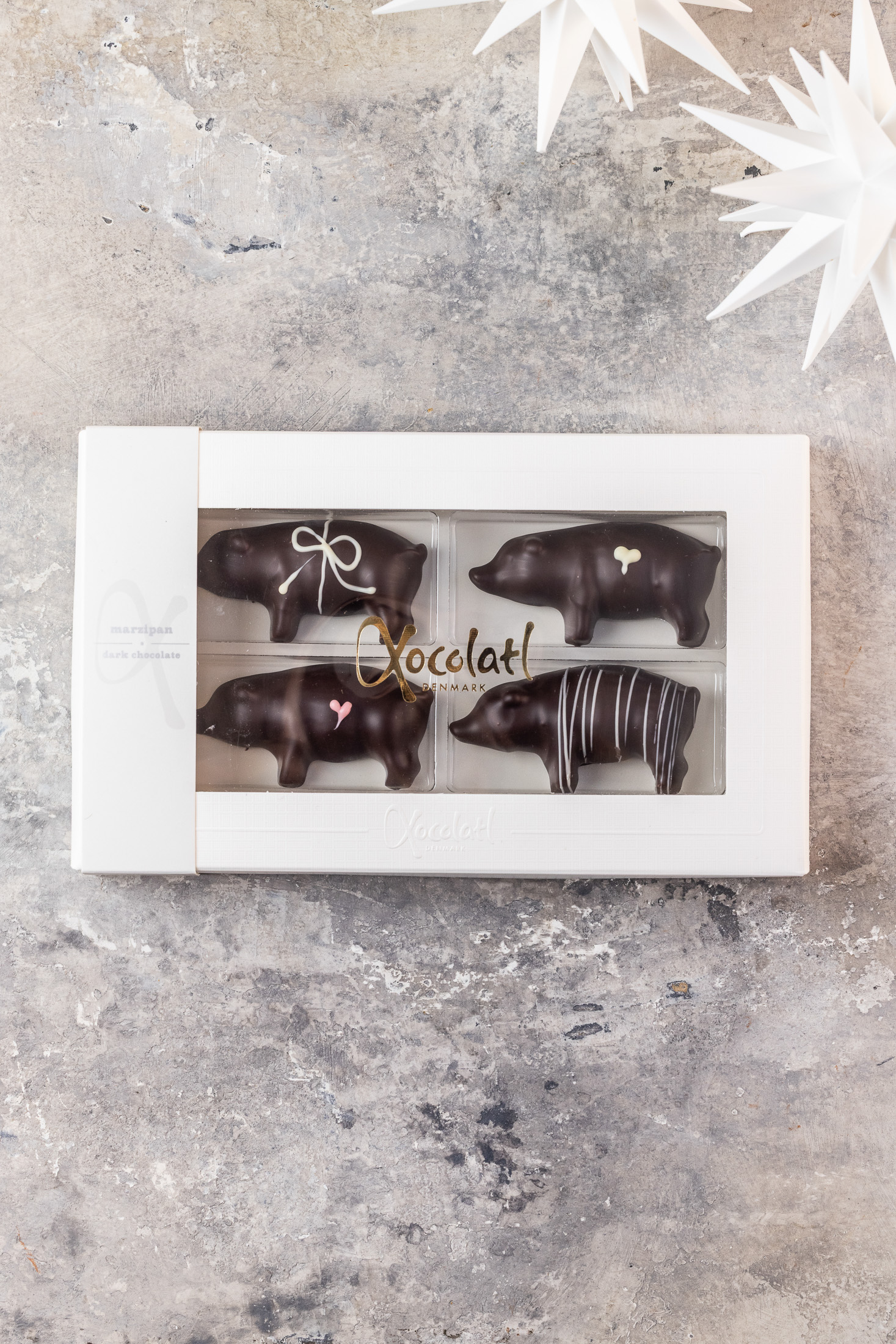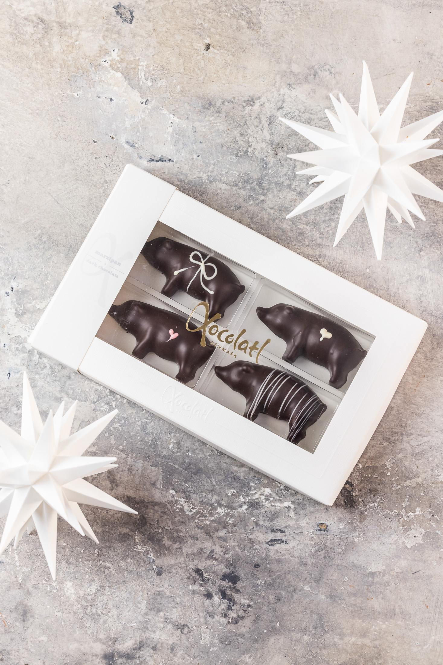 Four piggles er en charmerende gaveæske fra Xocolatl med fire hånddekorerede marcipangrise – to klassiske med 52 % mandler og mørk chokolade, og to med blød nougat og mælkechokolade. Hver gris er sirligt pyntet i hånden med chokolade og byder på en lækker kombination af kvalitet, smag og julestemning.