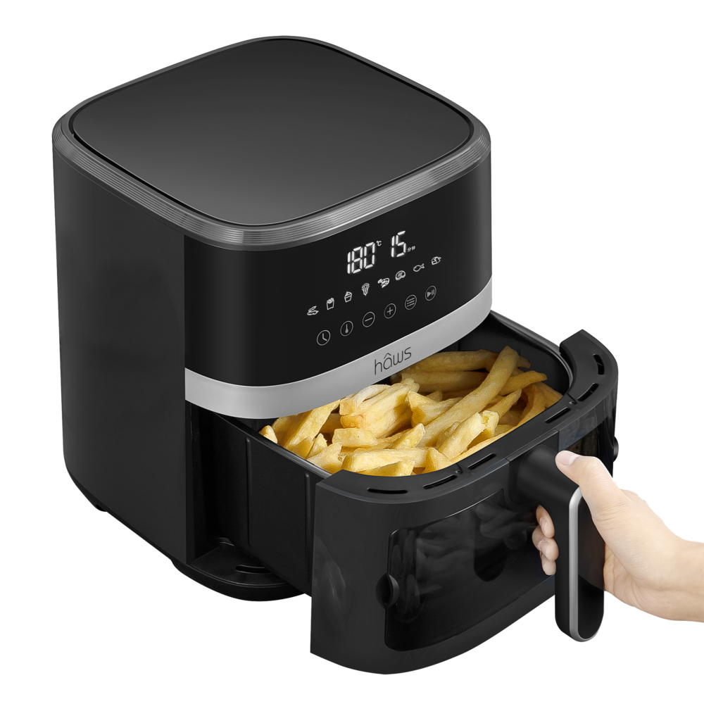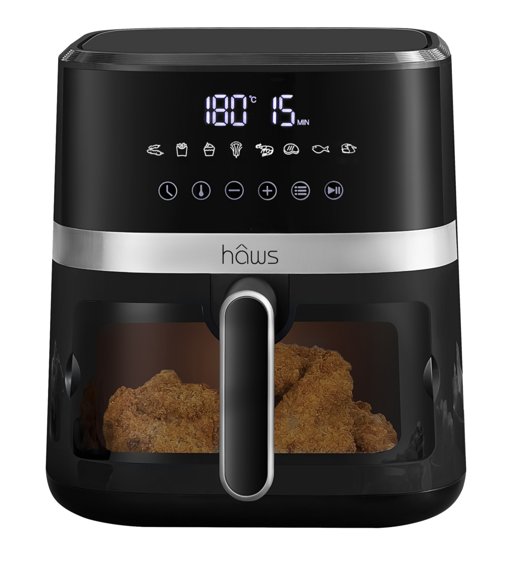 Hâws Airfryer 5,5L kombinerer kraftfuld ydeevne med brugervenligt design. Med en effekt på 1500W og 8 forudindstillede programmer kan du nemt tilberede alt fra sprøde pommes frites til saftige kyllingestykker. Den rummelige kurv med PFAS-fri non-stick belægning giver plads til store portioner, mens det gennemsigtige vindue gør det let at holde øje med maden under tilberedningen. LED-touchskærmen giver nem betjening med justerbar tid og temperatur, og funktioner som auto-sluk og overophedningssikring sikrer en tryg madlavningsoplevelse – ideel til både hverdag og gæster.