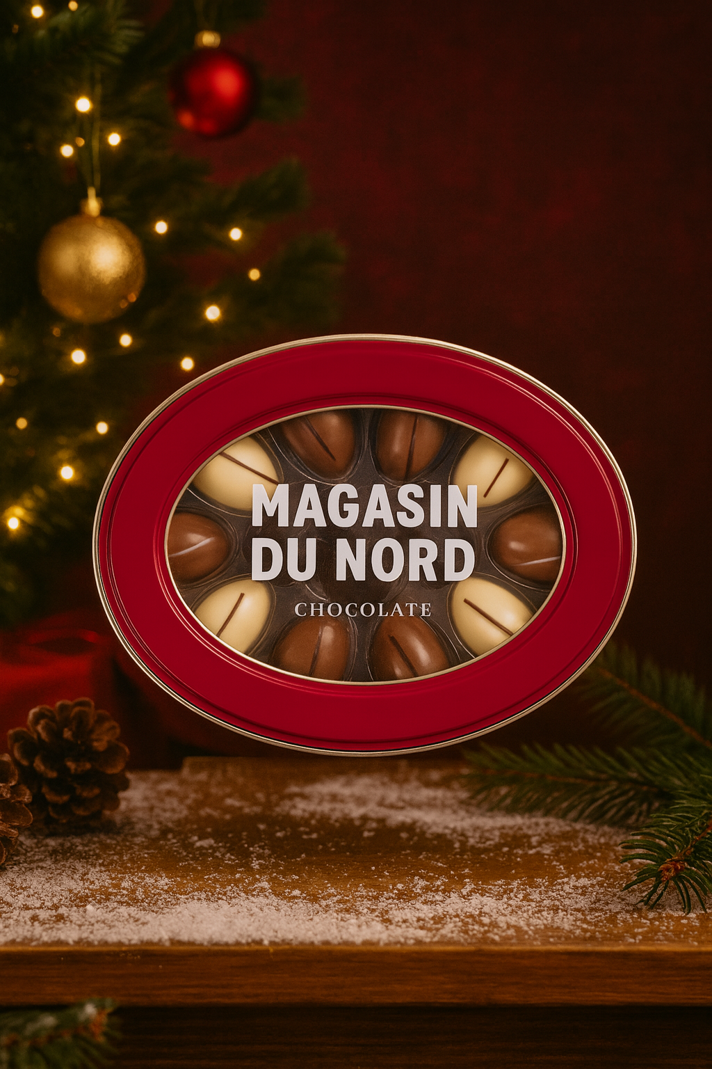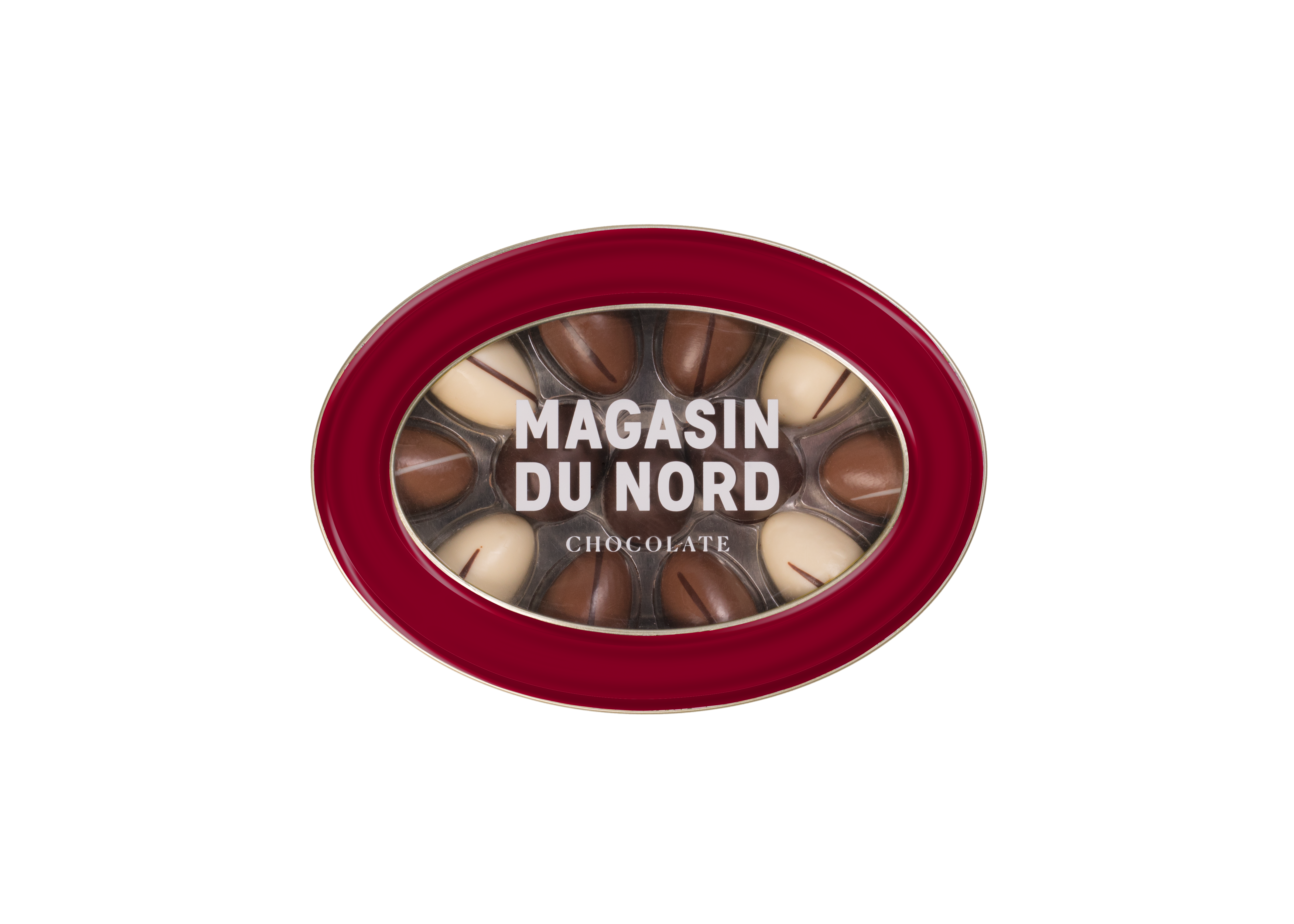 En elegant og klassisk tinæske fra Magasin Du Nord fyldt med 13 lækre chokoladetoppe. Tinæsken har et tidløst, ovalt design, der gør den velegnet som både gave og til personlig forkælelse. Chokoladen er fremstillet af nøje udvalgte ingredienser, der giver en fyldig smag og en perfekt balance mellem sødme og intensitet.