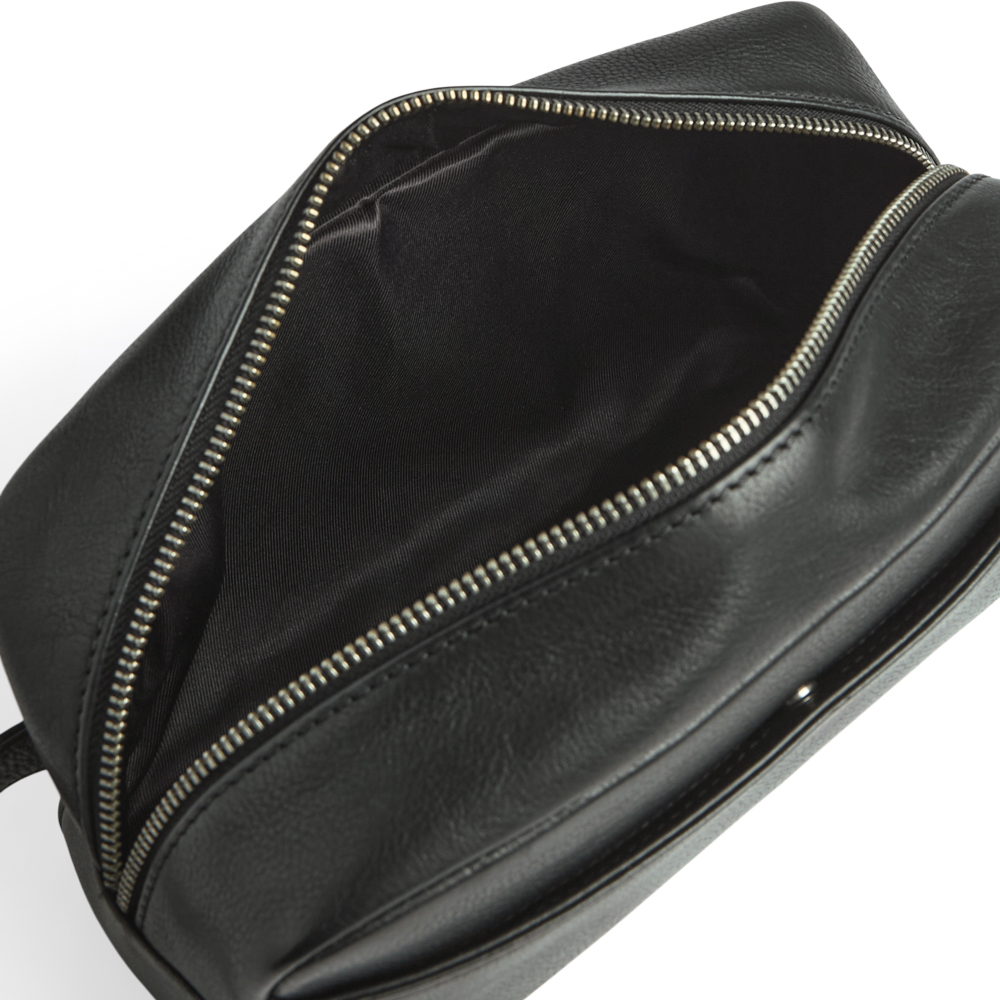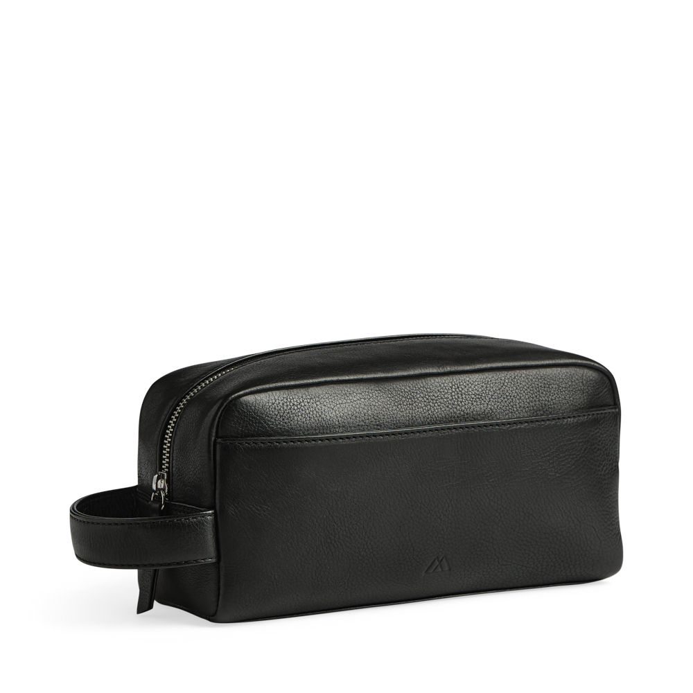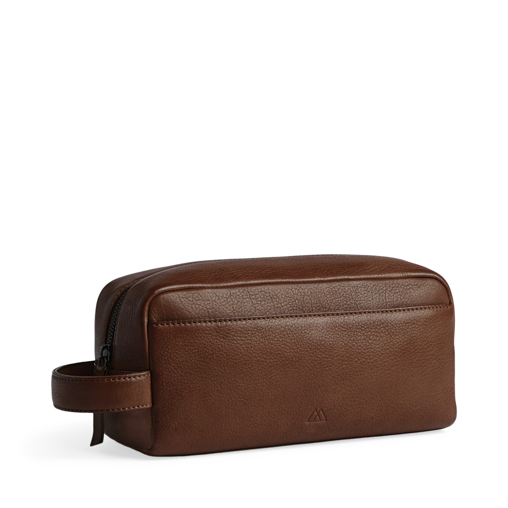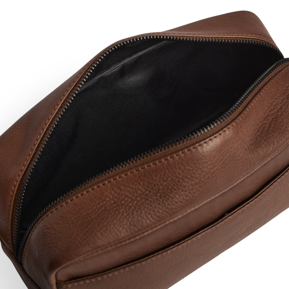 Markberg Dominic Toiletry taske lukkes med lynlås og har en funktionel læderstrop, så den kan bæres i hånden eller hænges på en krog på badeværelset. På fronten er en lomme til ekstra opbevaring.