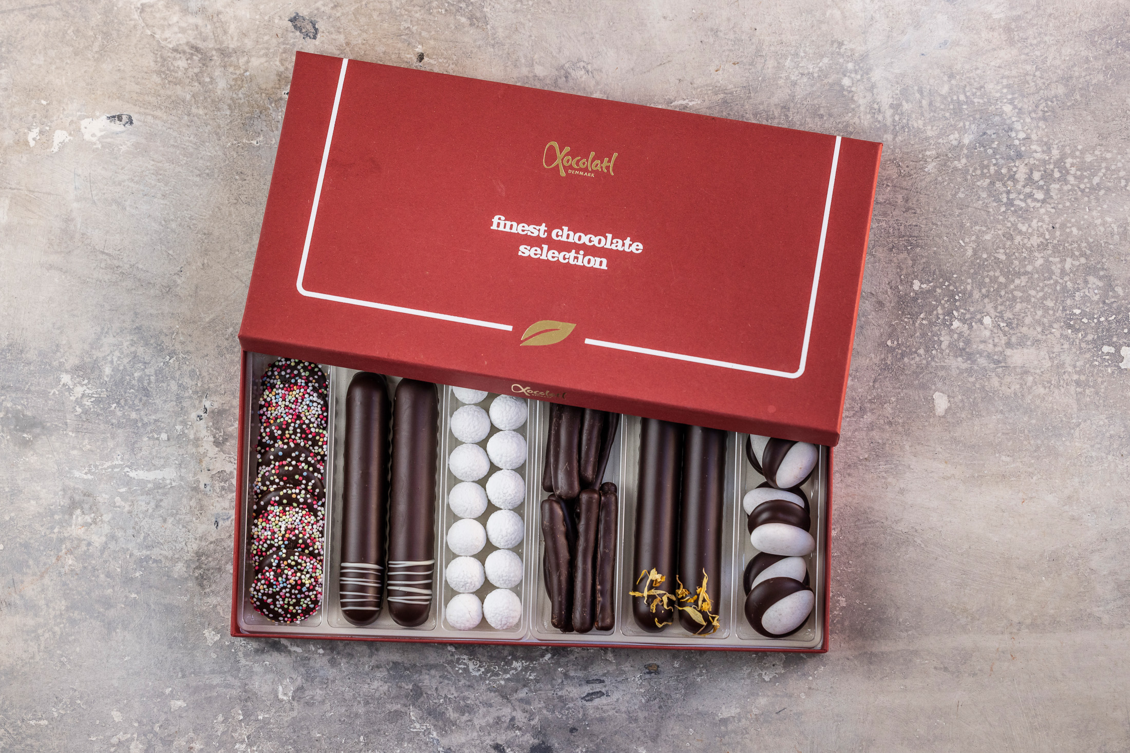 MERRY CHERRY OLD SCHOOL SELECTION fra Xocolatl er en gaveæske fyldt med nostalgiske julefavoritter. Æsken indeholder snebolde, orangegrene, sprøde dronningemandler med mørk chokolade, mintpoletter og rene marcipanstænger overtrukket med mørk chokolade. En klassisk og smagfuld samling – perfekt til dem, der elsker de gode, gamle julesmage.