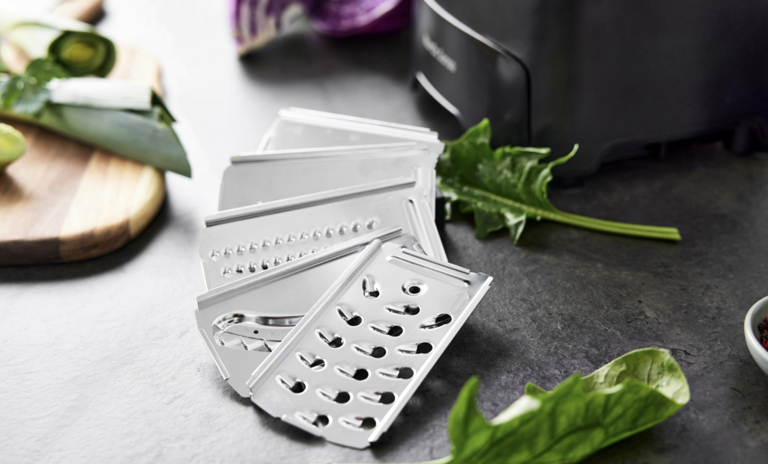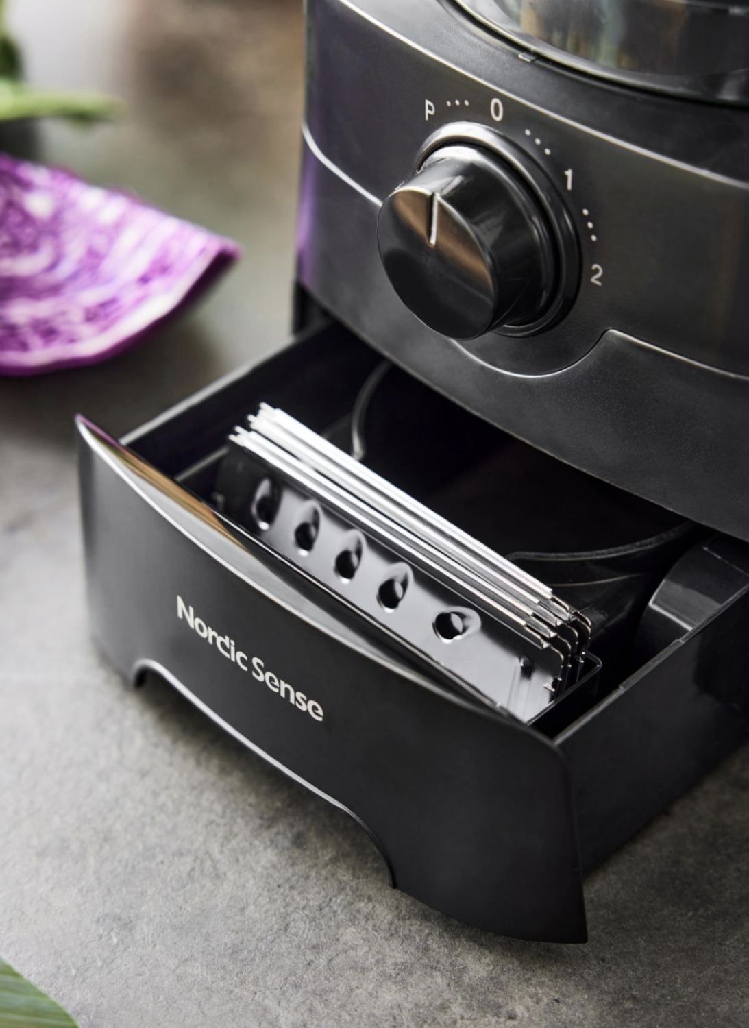 Alt tilbehøret kan praktisk opbevares i den indbyggede skuffe, så du altid har overblik og orden i køkkenet.