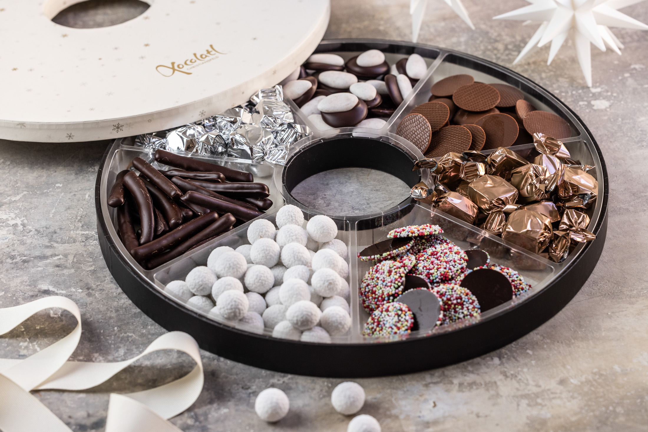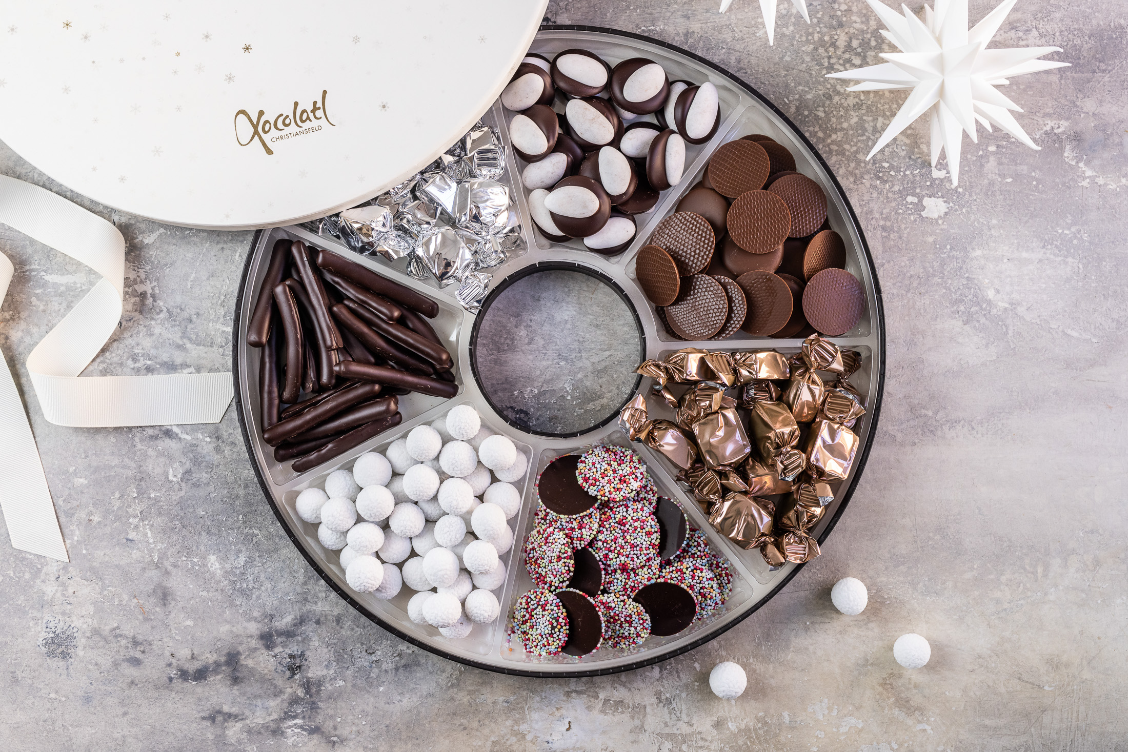 Snow crystal selection mix er en stor og overdådig gaveæske fra Xocolatl, fyldt med alt det bedste til julens hyggestunder. Æsken indeholder orangegrene med mørk chokolade, fyldte chokoladepoletter med mintkaramel og flødekaramel, sprøde dronningemandler med mørk chokolade, sprøde hasselnødder med mørk chokolade og sukkerskal samt fyldte chokolader med nougat og karamel. En gennemført gaveidé med noget for enhver smag – perfekt til deling eller som gave med wow-effekt.