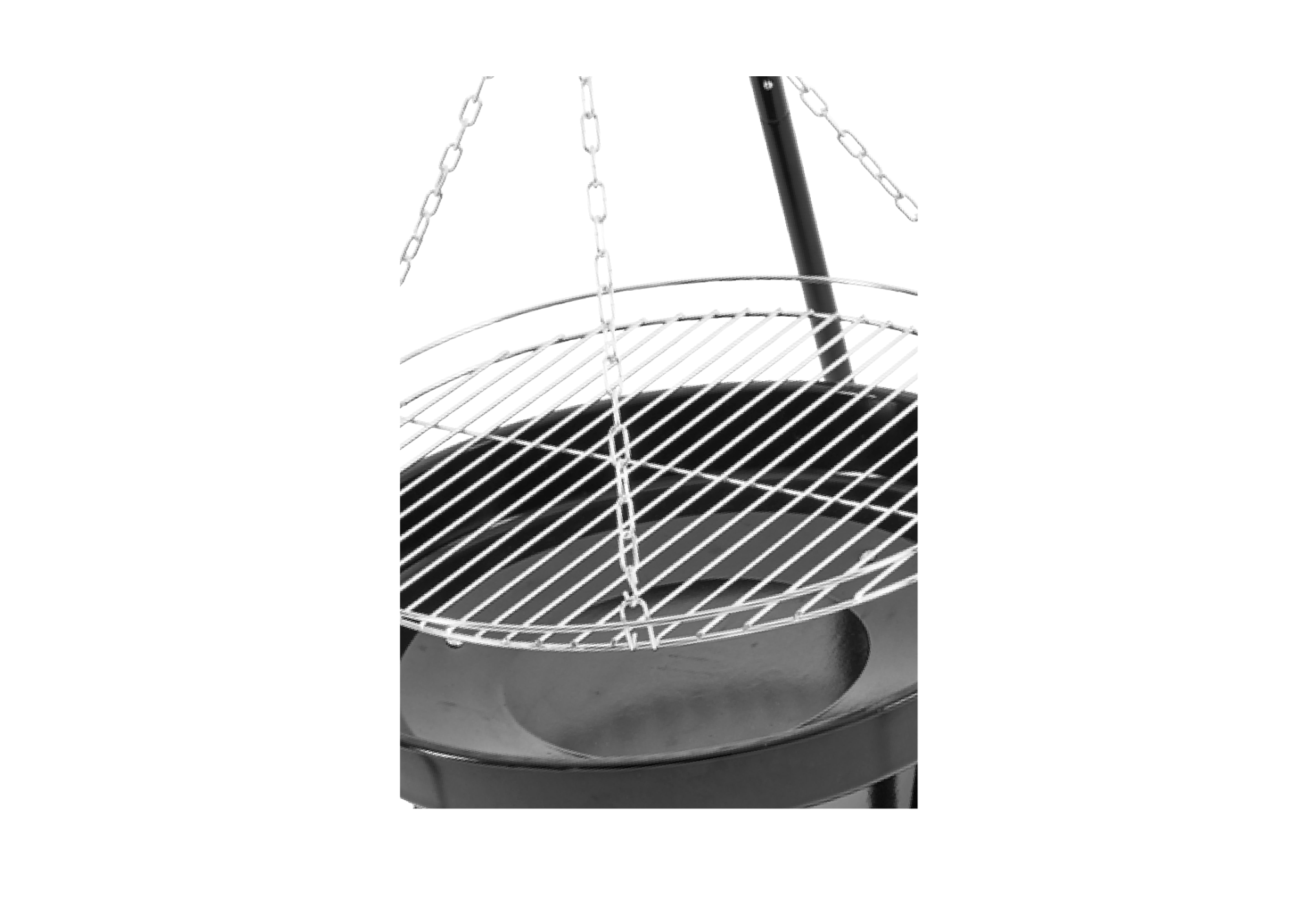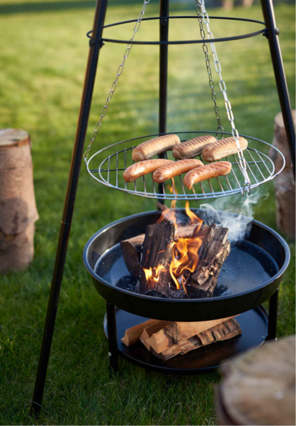 Denne Tripod med bålfad og grillrist giver dig den ægte udendørs madoplevelse, perfekt til havehygge, camping eller shelterture. Med en højde på cirka 150 cm og et robust bålfad i Ø52,5 cm, har du god plads til både bål og grillmad. Den forkromede grillrist (Ø45 cm) hænger i en zinkbelagt kæde og kan nemt justeres i højden.