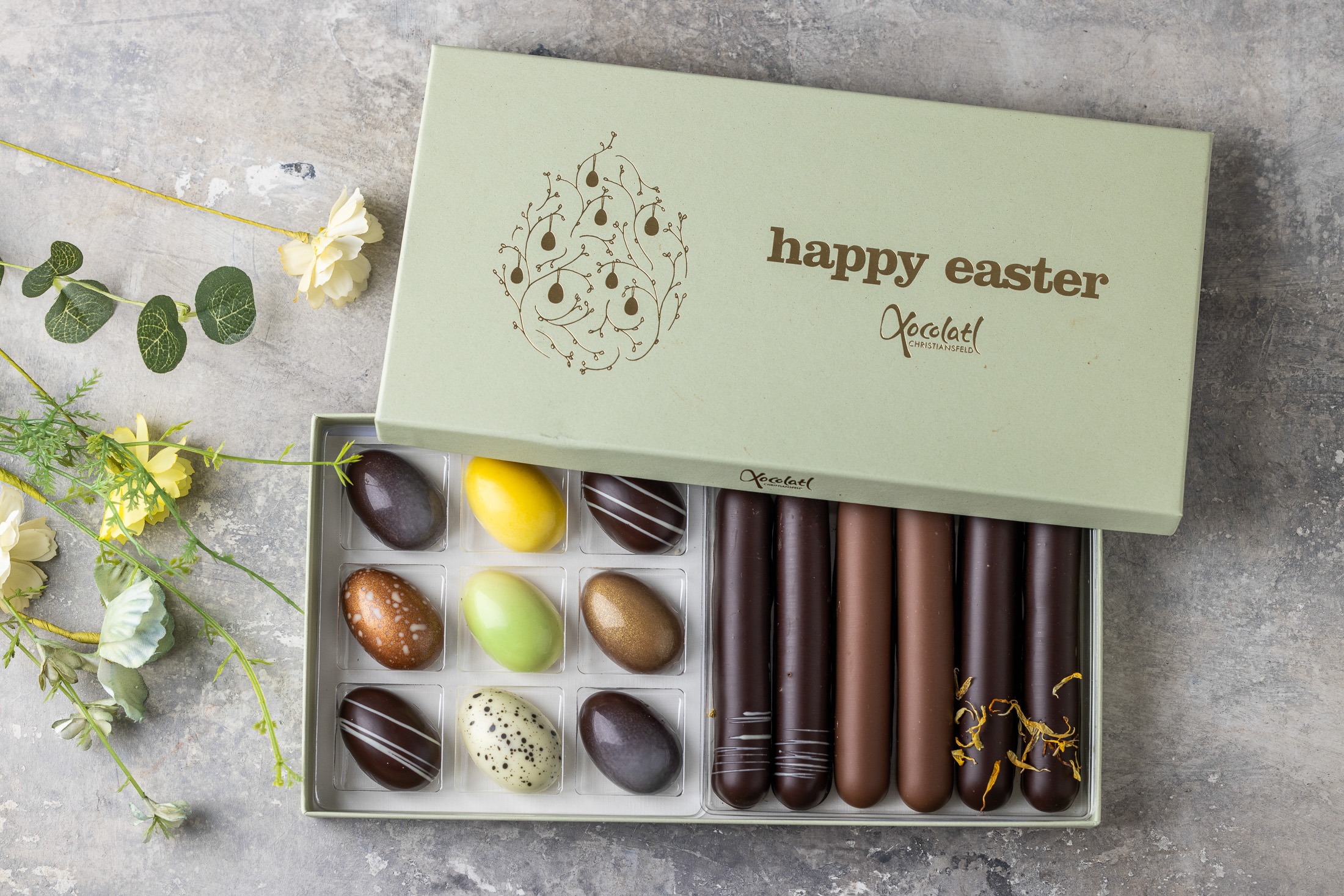 Xocolatl Golden Eggs art 9 marzipan indeholder 9 fyldte chokolader og 6 marcipanstænger med citron, solbær og ren klassisk marcipan. 320 gram.